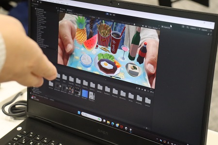 続いて実習に入り、3Dゲームを作成できるゲームエンジン「Unity」を用いて、カメラに3Dモデルを表示させるARの完成を目指しました。受講者たちは「Unity」を操作しながら、3Dモデルを浮かび上がらせるマーカー(台紙)を設定、仮のモデルを読み込みマーカー上に表示させてみる、というように段階的に学んでいきました。次にウェブ上で公開されている3Dモデルを利用して、複数を組み合わせたり、サイズを調整したりしながら、それぞれが思い描く3Dモデルの作成に取り掛かりました。作成した3Dモデルをマーカー上に表示させてみると、マーカーから飛び出てしまったり、モデル同士が重なってしまったりと苦労しながらも取り組んでいき、全員がARを作り上げることができました。最後は完成したそれぞれのARを受講者同士で体験し、「組み合わせの発想がすごい」「世界観がすばらしい」「朝食の再現、完璧」といったコメントを互いに伝え合いました。