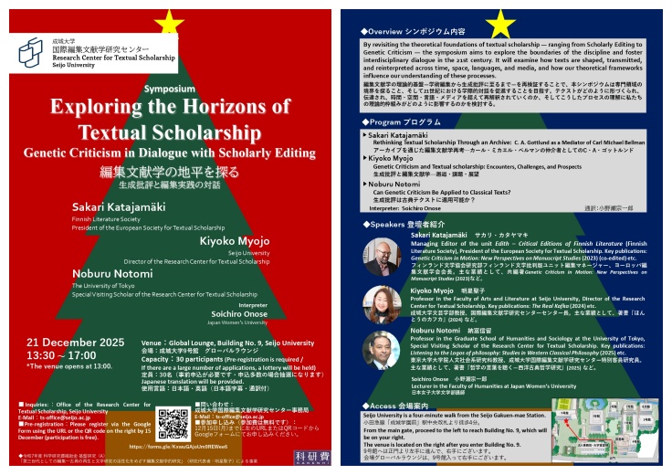 国際編集文献学研究センター主催の編文研シンポジウム「編集文献学の地平を探る—生成批評と編集実践の対話」を下記の要領で開催いたします。詳しくはチラシをご覧ください。