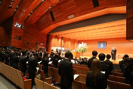 戸部学園長の祝辞では、「ともに喜ぶ、感謝する」という「Congratulations(おめでとう)」のラテン語の語源を紹介し、「おめでとう」と言う人と、それを受けて「ありがとう」と言う人が一緒にうれしい気持ちになるのが本来の姿であると述べました。そして会場の新入生に向けて「おめでとう」と促すと、新入生から「ありがとう」の声が。会場中が温かい空気に包まれました。