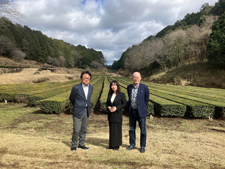 当日は所長自ら施設概要を説明いただいただけでなく、マイクロバスに乗車して広大な農場をご案内いただき、茶畑を背景に写真を撮る機会もいただきました。前日までの雨が嘘のように晴れ渡る、好天に恵まれた視察となりました。