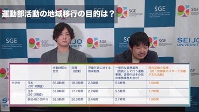 この地域移行の主な背景として、下竹助教は教員の負担問題を挙げました。2013年にOECDが行った「TALIS調査」において、日本の中学校教員の部活指導時間が世界中で突出していることが明らかになりました。特に休日の部活動指導時間が長いというデータから、教員の多忙化問題を解決するために、まず休日の部活動を地域移行しようという方針が生まれたのです。