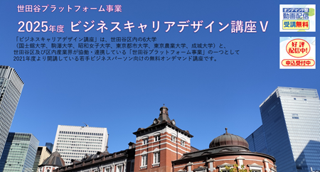 「ビジネスキャリアデザイン講座」とは、世田谷区内の6大学(国士舘大学、駒澤大学、昭和女子大学、東京都市大学、東京農業大学、成城大学)と、世田谷区、区内産業界が協働・連携している「世田谷プラットフォーム事業」の一つとして2021年度より開講している若手ビジネスパーソン向けの無料オンデマンド講座です。社会人や学生を対象としたリカレント教育や学び直し、新たな知識やスキル習得の機会を提供・醸成することを目的としています。