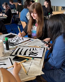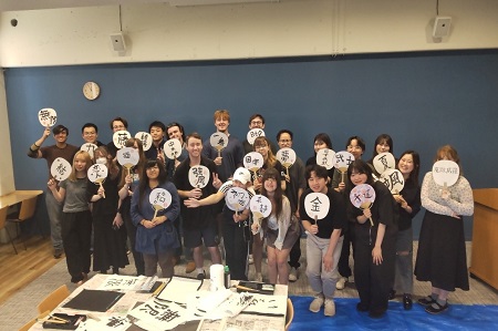毎学期行われている交換留学生のための日本語の授業で、日本語ボランティアの成城生の協力の下、5月23日(木)に、書道体験が行われました。今回は夏に向けて、うちわに各々好きな文字を書きました。筆を持つのも初めての留学生は、一文字書くのに苦戦していましたが、ボランティアの成城生が根気よく丁寧にアドバイスをしてくれました。前期で帰国してしまう留学生にとって、思い出に残る日本のお土産になったのではと思います。