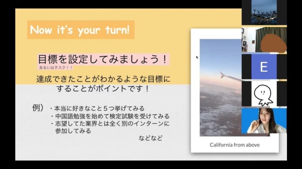 あらゆるターニングポイントで、自分の気持ちに素直になり根本から自分に問いただすDecision-making(決断)を行ったそうです。就職活動をしながらも、大好きな事や一生やりたい事などを考えて、思い切って就職活動を全て止めて大学院に進学をする決断を導き出しました。そしてその経験から、「目的や目標を言語化して、人に伝えることが大事」という事を学び、在校生に向けて目標設定の方法を話されました。